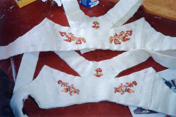 Course leader Eli Vesaas brings out examples of her own woven vadmel which have been cut out and embroidered. When this bodice is completed it will be part of her daughter's bunad. | During his spare time, Olav Vesaas makes silver buttons, clasps and broaches based on traditional Telemark design. Students were able to purchase some of his exquisite pieces for their vadmel garments. |
