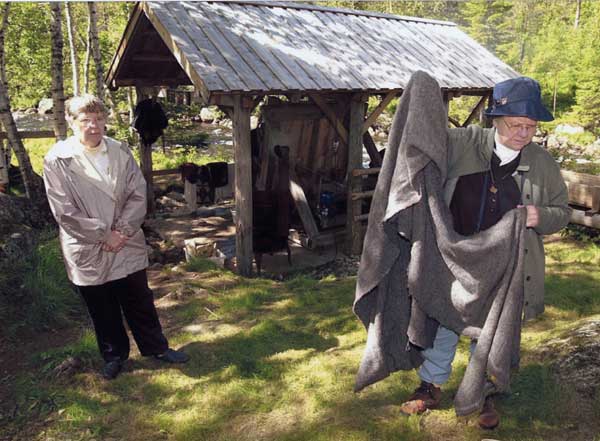 The stampa, located at nearby Mjonøy Handcraft and Cultural Center is run by a water wheel. Course leader Eli Vesaas places the woven cloth in the stampa with warm water and starts to time the process. |