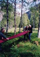 Class members worked together to stretch the damp vadmel in the birch forest near the stampa.